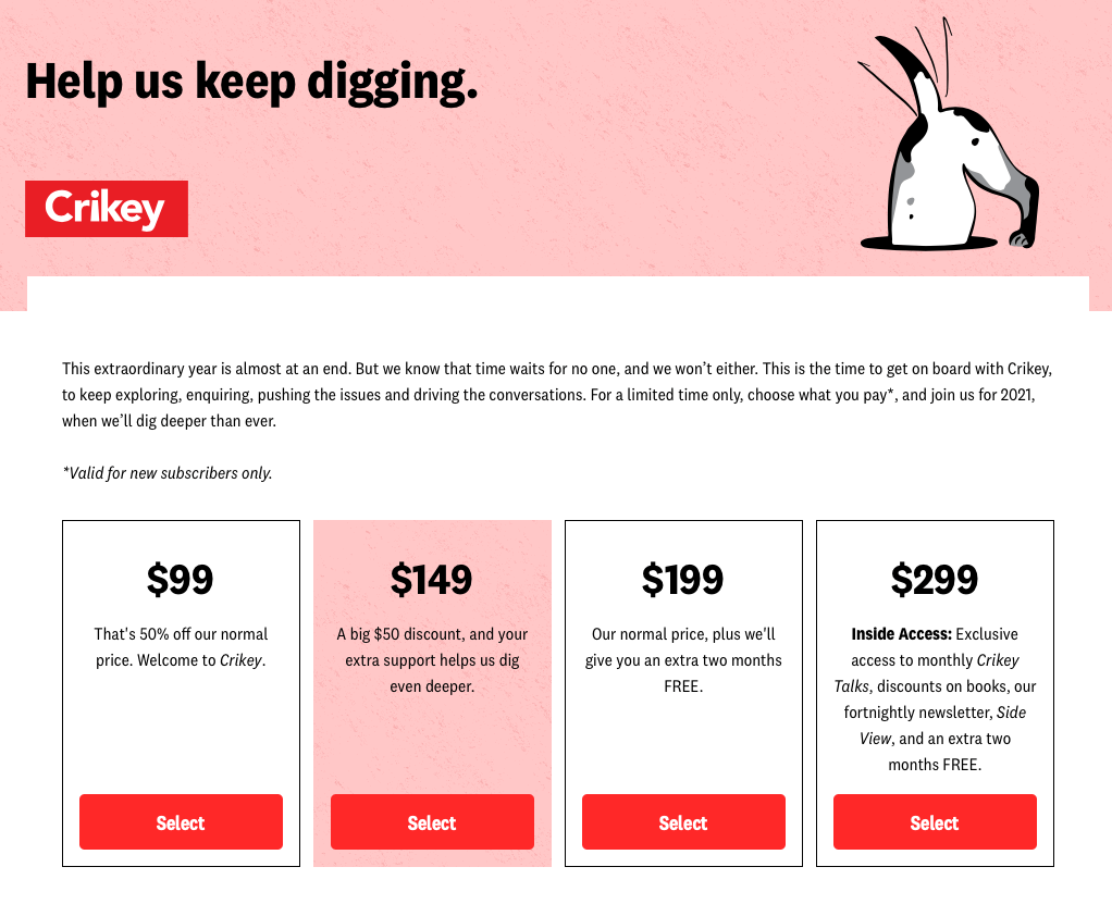 First campaign, our first ever pay as you feel sale. No other Australian publisher and barely any other worldwide have tried a pay as you feel model. It was uncharted waters. Will people just pay the minimum? Will they pay more just to support the journalism? The brief was to structure the model and make it work.