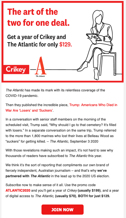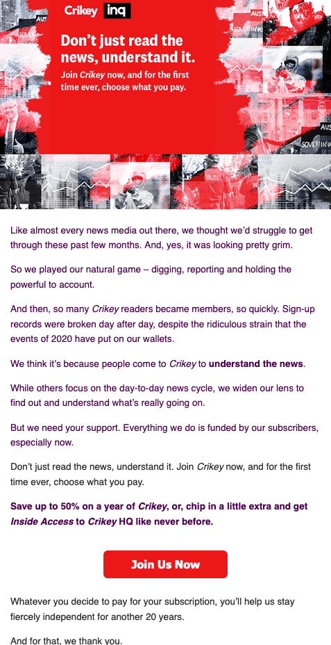 From 2018 to 2022 I was the lead copywriter at Private Media, the publisher of Crikey, Smart Company and The Mandarin. I worked on the publisher’s creative strategy based on visitor analysis, came up with the ideas and write the advertising to turn readers of these popular online magazines into subscribers.