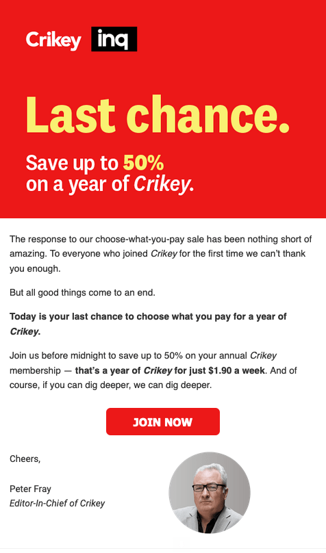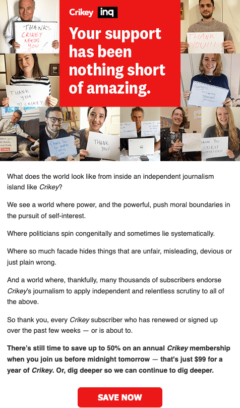 Thanks to the idea of boosting goodwill to the brand (people just love being asked to help out), and by getting everyone at the company involved, it was Crikey’s most successful campaign ever by a long, long way.