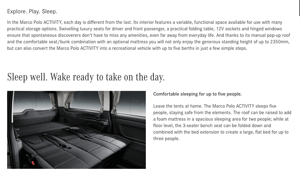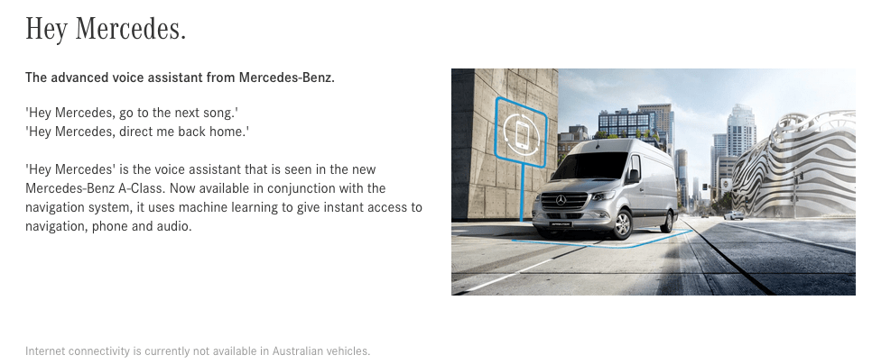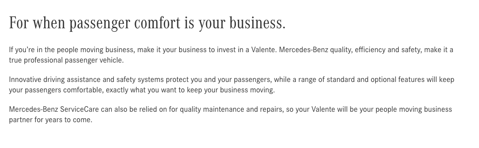 Working at The Royals with another copywriter coming in to help later in the project, I was asked to rewrite all the content on the Mercedes-Benz Vans website. Working from a recent translation of the German website, I had to rewrite everything to match the distinctive Australian campaign tone.